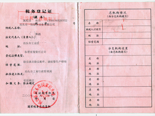 一恒稅務(wù)登記證-一恒稅務(wù)登記證-泊頭市一恒除塵設備有限公司